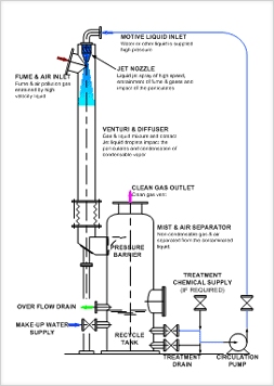 随着产业的开发,因烟尘、灰尘及污染气体引起的空气和环境污染已成为非常严重的问题。为了解决这种问题,灰尘一般运用过滤器、袋式过滤器或电子过滤器使用触媒进行分解。但是,因为灰尘还有较多湿气或污染物质很容易损坏触媒。干式净化器是一种解决这种环境污染问题的装备,它广泛在各种工业现场使用。图2展示的干式净化器主要由喷嘴、喉管、雾化器和尘土与气体分离机构成。它依靠循环泵将高压水从喷嘴以每秒15-30米的速度喷射到喉管。高速小水珠会在气体流动中凝缩毒性气体、烟尘及尘土或吸收不能凝缩的气体混合物。它们在雾化器中同吸收的气体进行碰撞,吸收灰尘并凝缩。
