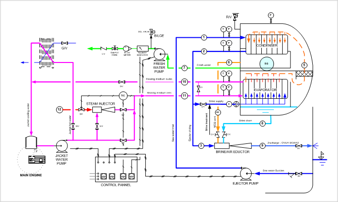 为在船舶或岛屿等孤立的场所得到引用或洗漱用淡水需要用真空蒸馏装置。DHP真空蒸发蒸馏器以DHP的钛板热交换机为基础。一个用于蒸发加热的盐水,一个用于凝缩水蒸汽。真空室依靠从同冷凝器相连的喷射器中驱动的海水维持。加热的海水作为蒸发用供应水使用,蒸发温度依靠真空压力进行调节。蒸发蒸馏水通过变流装置、除雾器和流动的水珠,然后进入冷凝器。蒸馏水的蒸汽依靠冰凉的海水凝缩。蒸馏的蒸馏水依靠淡水泵输送到外部的泵并确认盐分。如果盐分超过一定的水平,淡水泵排出生产线中的电磁阀会自动打开。超过蒸馏水的盐分会重新流会蒸馏室。详细事宜请参照设计图。 |